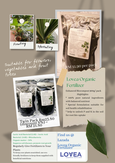 Lovea Organic Fertilizers also knows as the enhanced bio-compost, is packed in 900 gram per pack. It is 100% pure natural ingredients with balanced nutrient. It also helps to unlock P and K in the soil for root bio-uptake